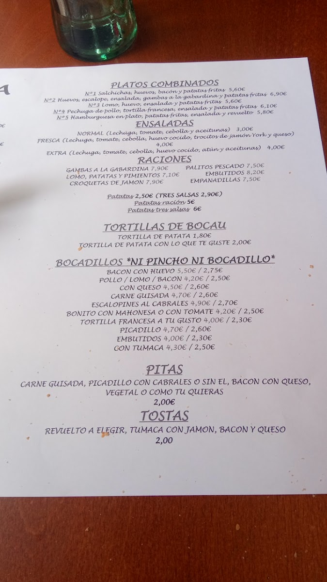 Con carne, lomo, bacón, queso, huevo a la plancha, lechuga, tomate, cebolla y pepinillo. Acompañado de patatas y bebida